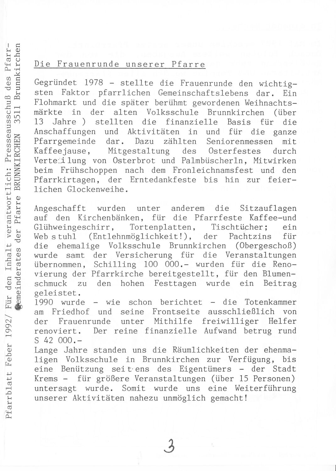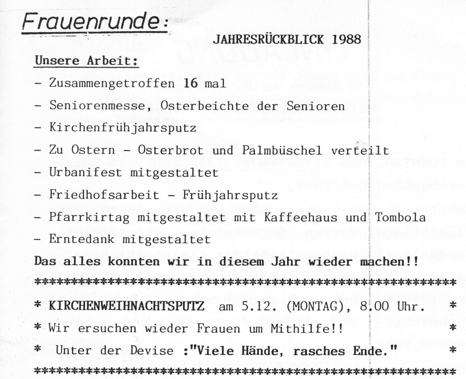 Die Frauenrunde wurde 1978 von Frau Elfriede Brandl gegründet. In bester Erinnerung sind sicher noch die Weihnachtsbastelmärte in den Räumen der ehemaligen Volksschule (jetzt Kindergarten). Mit dem Erlös dieser Veranstaltungen wurde u.a. auch die Renovierung des so genannten Totenkammerls beim Eingang zum Friedhof finanziert. Nachdem ab 1989 die Räumlichkeiten der Volksschule nicht mehr zur Verfügung standen waren auch die Aktivitäten der Frauenrunde begrenzt. Für die Senioren wurde jedes Jahr vor Ostern eine Messe mit Beichtgelegenheit geboten und auch die Kirchenreinigung hat die Frauenrunde übernommen.