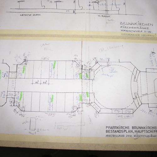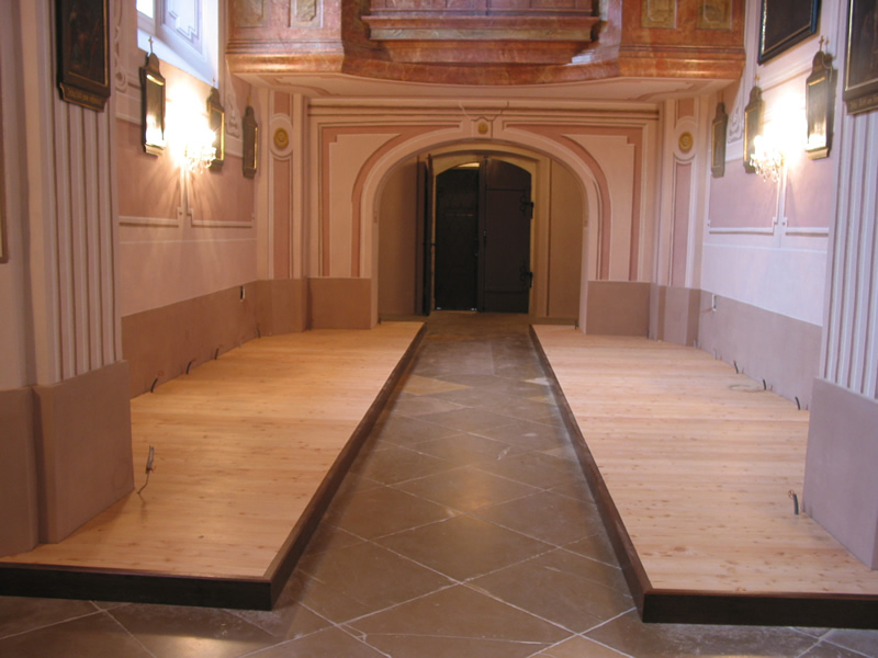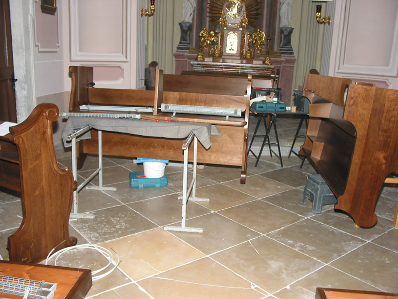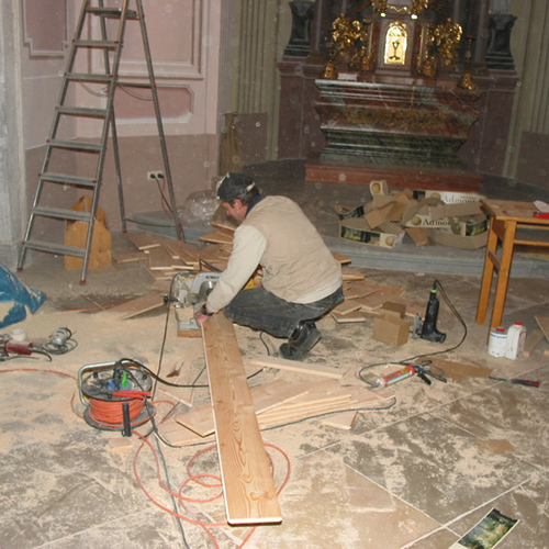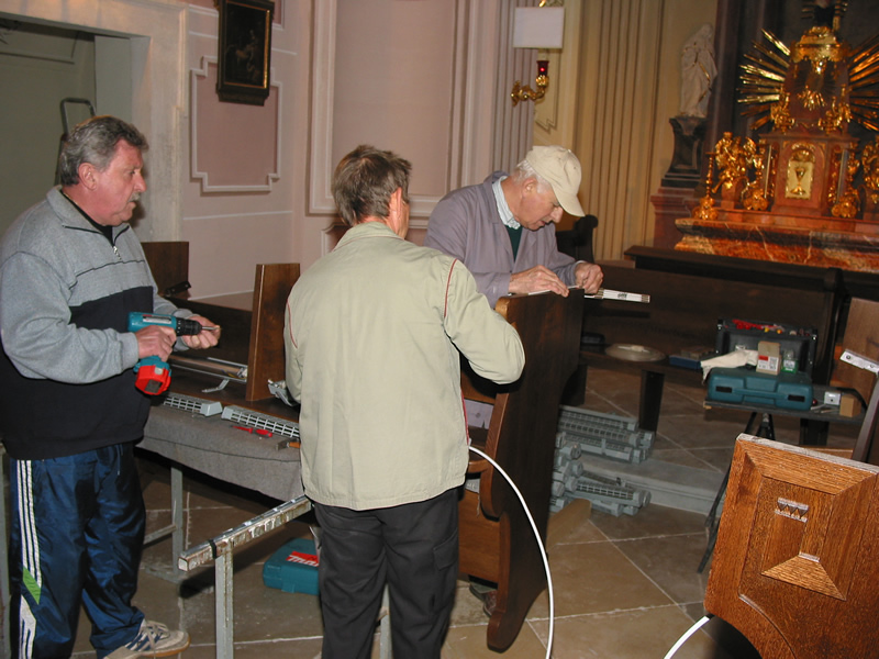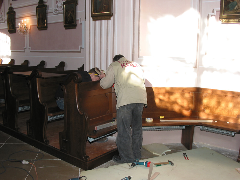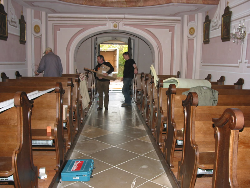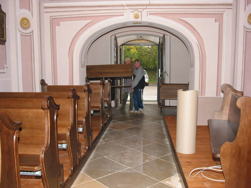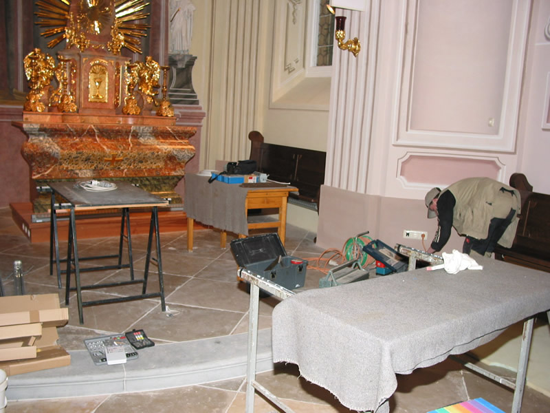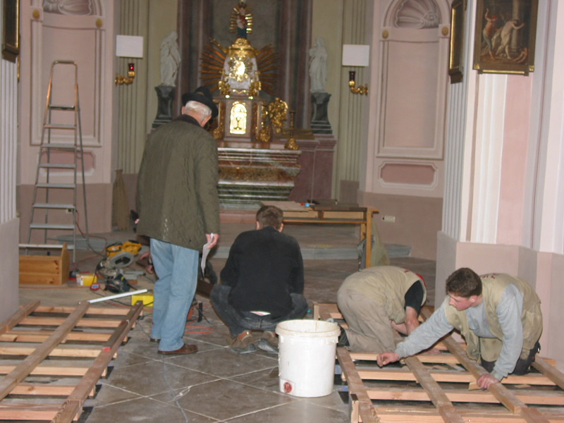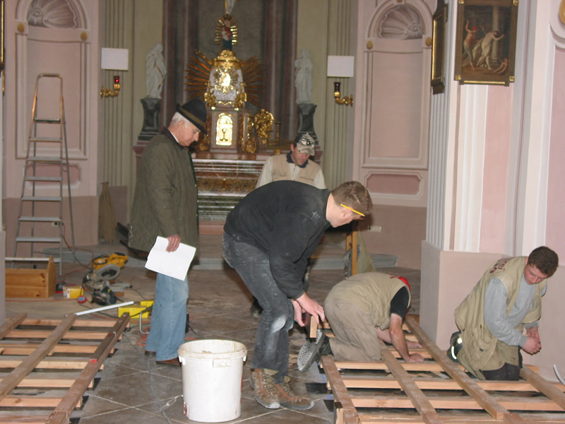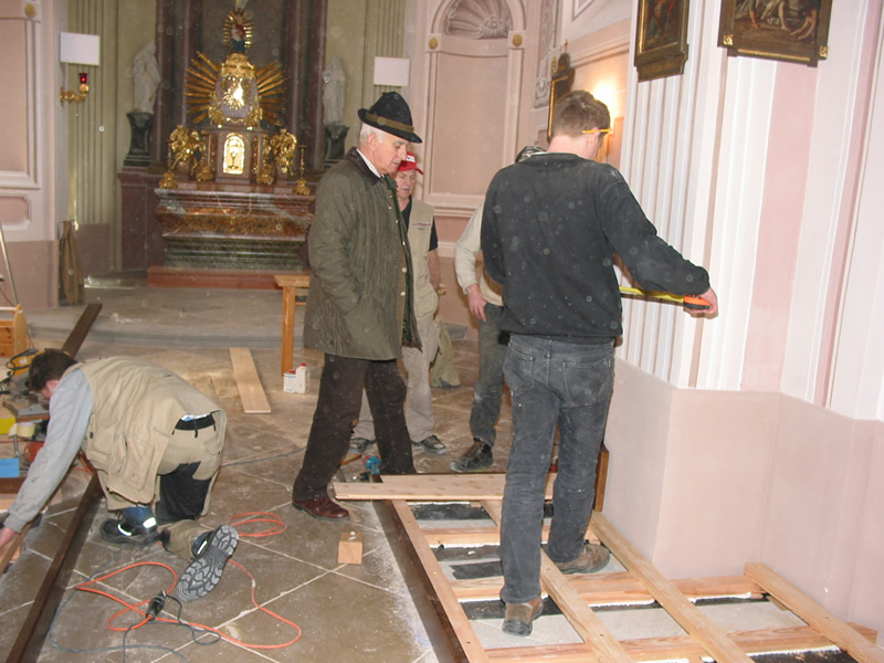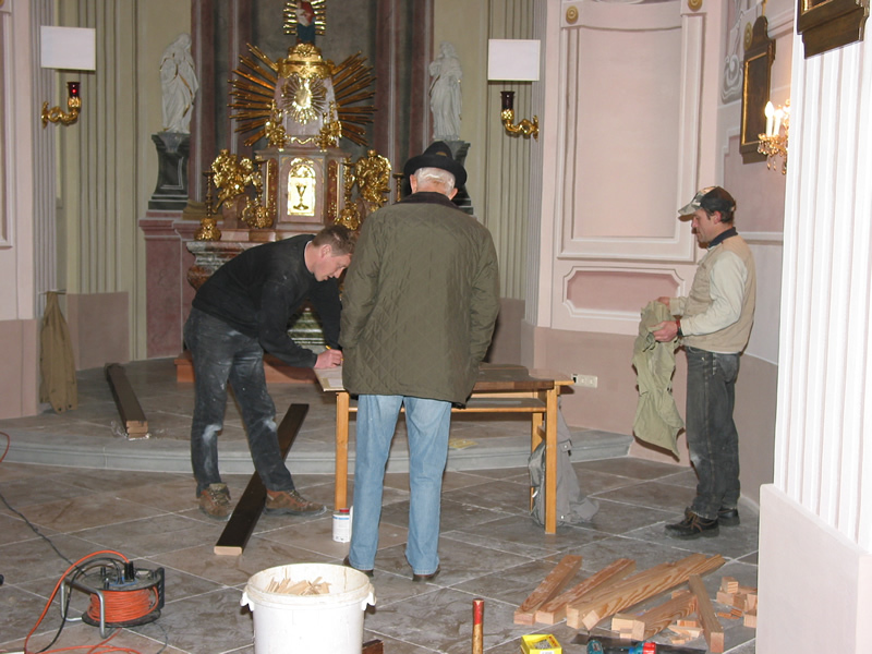 Inhalt der Galerie: Familiengottesdienst in der renovierten Kirche mit den Sesseln vom Pfarrheim, Einrichtung der Seitenkapelle mit Pieta und Hl. Grab (Fa. Waldbauer), Einbau der Podeste für die Kirchenbänke und Einbau der Kirchenbänke (Fa. Kolm), Hochaltar in neuem Glanz, Status vor der Endreinigung